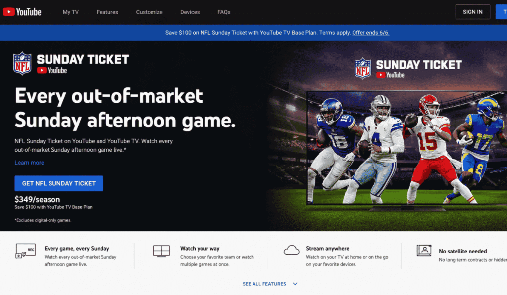 As an example; if your top team is playing in a different city and the match isn’t on local TV, you can still catch every second of it live from touchdowns to big plays to final whistling in full HD. Previously limited to satellite TV, that service has since moved to streaming; it is now a YouTube TV exclusive that can be accessed on phones, smart TVs and laptops.